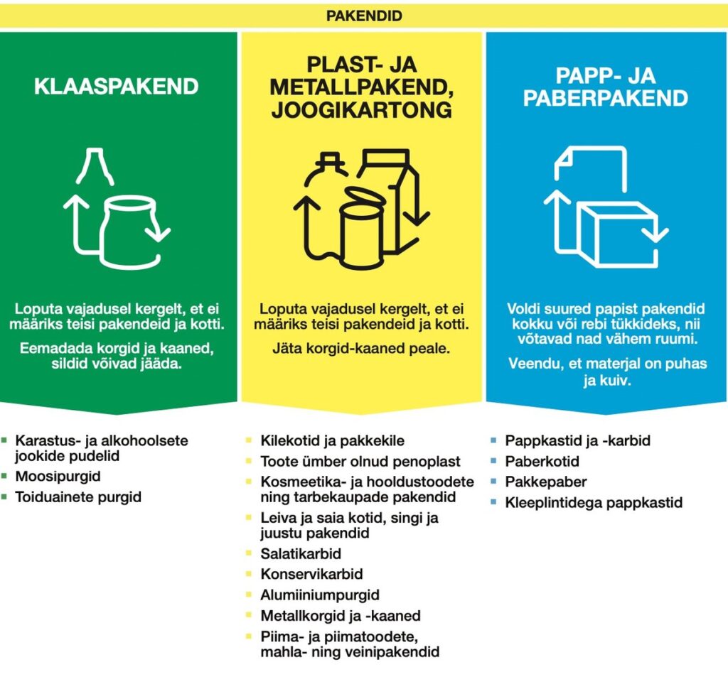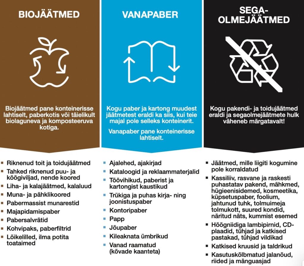 Peamised jäätmeliigid on ülal välja toodud. Kodude juurest ei kao kuskile vanapaber, biojäätmed, segaolme. Kuigi pakend ei ole korraldatud jäätmeveoga seotud, soovitame elanikel siiski võtta kodu juurde plasti + metallpakendi ja klaaspakendi mahuti. Võimalik, et kunagi on ka pakendimahutid kodude juures kohustuslikud, kuid hetkel regulatsioonid seda takistavad.